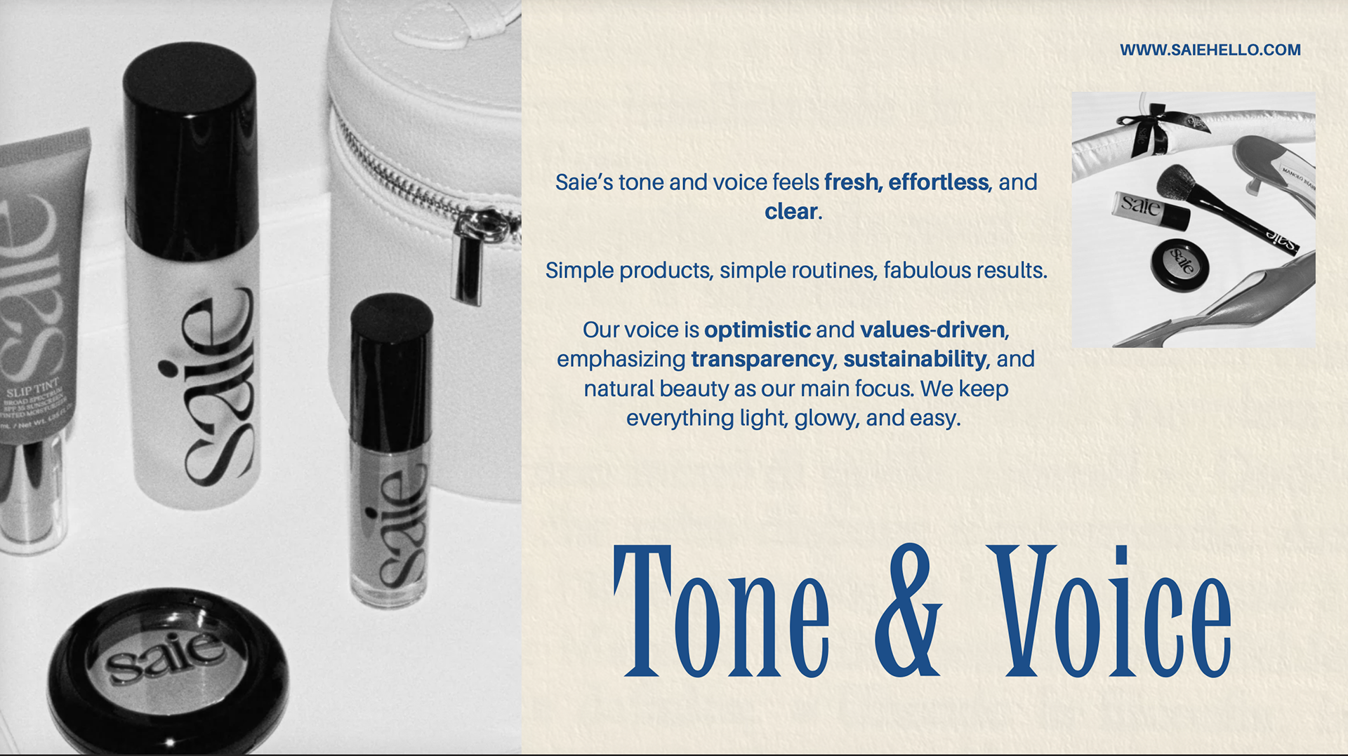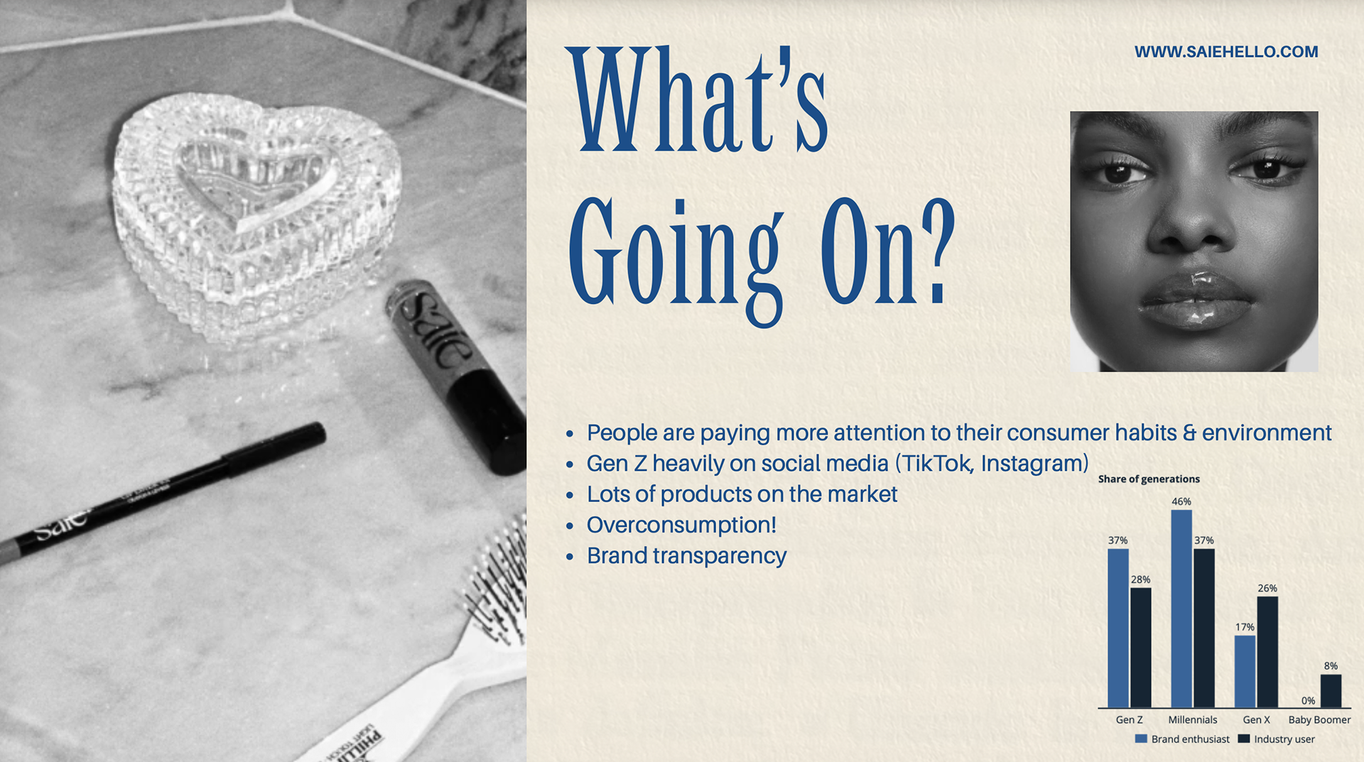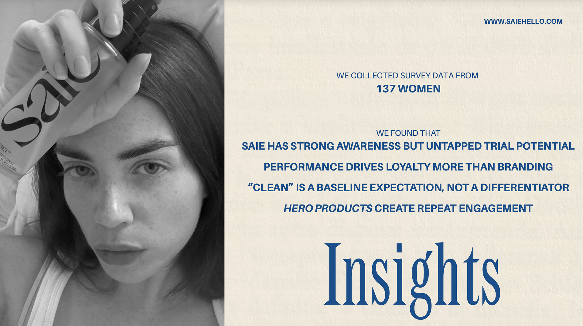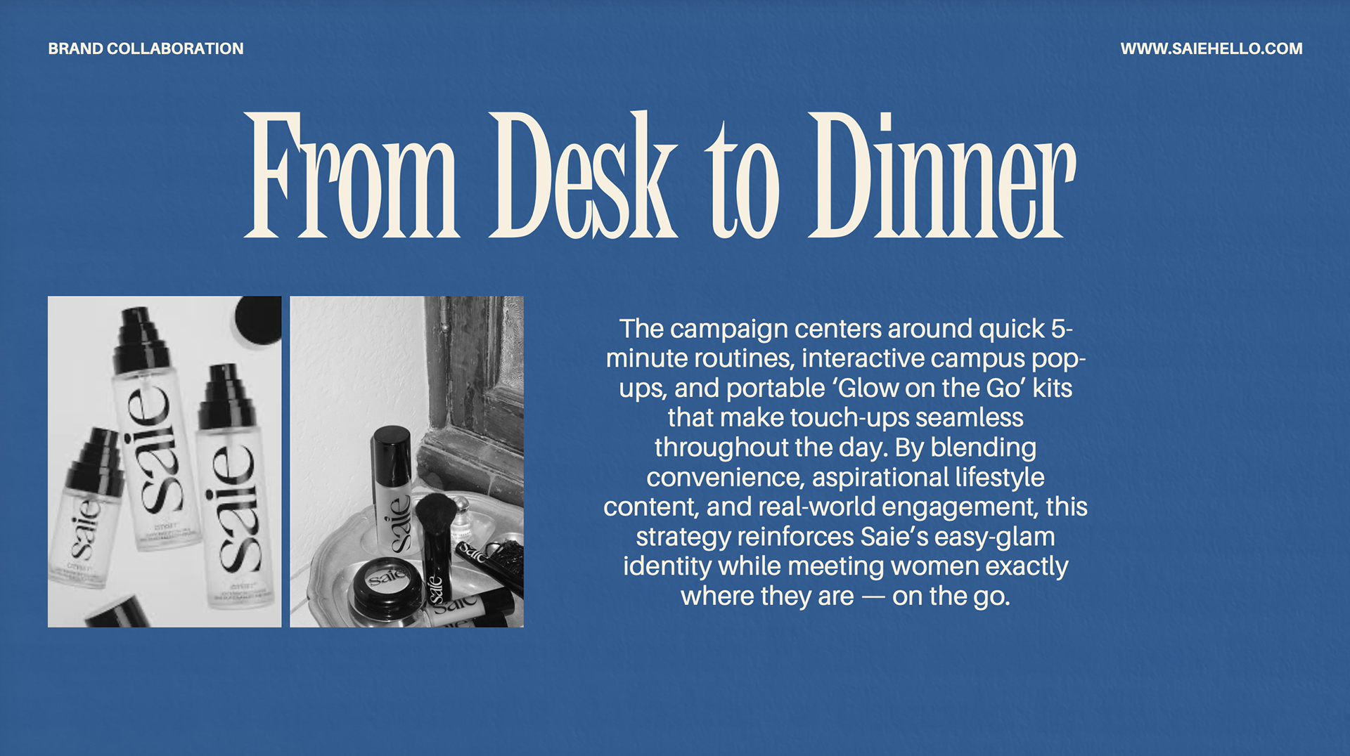 This project defines the brand purpose strategy for Saie Beauty, focusing on turning strong brand awareness into product trial and loyalty among Gen Z consumers. Using research and insights, we positioned Saie as a leader in effortless, high-performing, skin-first beauty, brought to life through the “From Desk to Dinner” campaign and accessible, on-the-go product experiences.